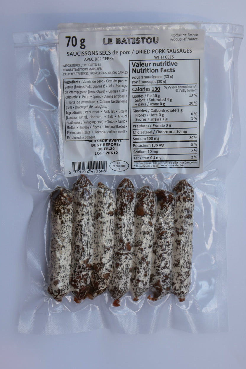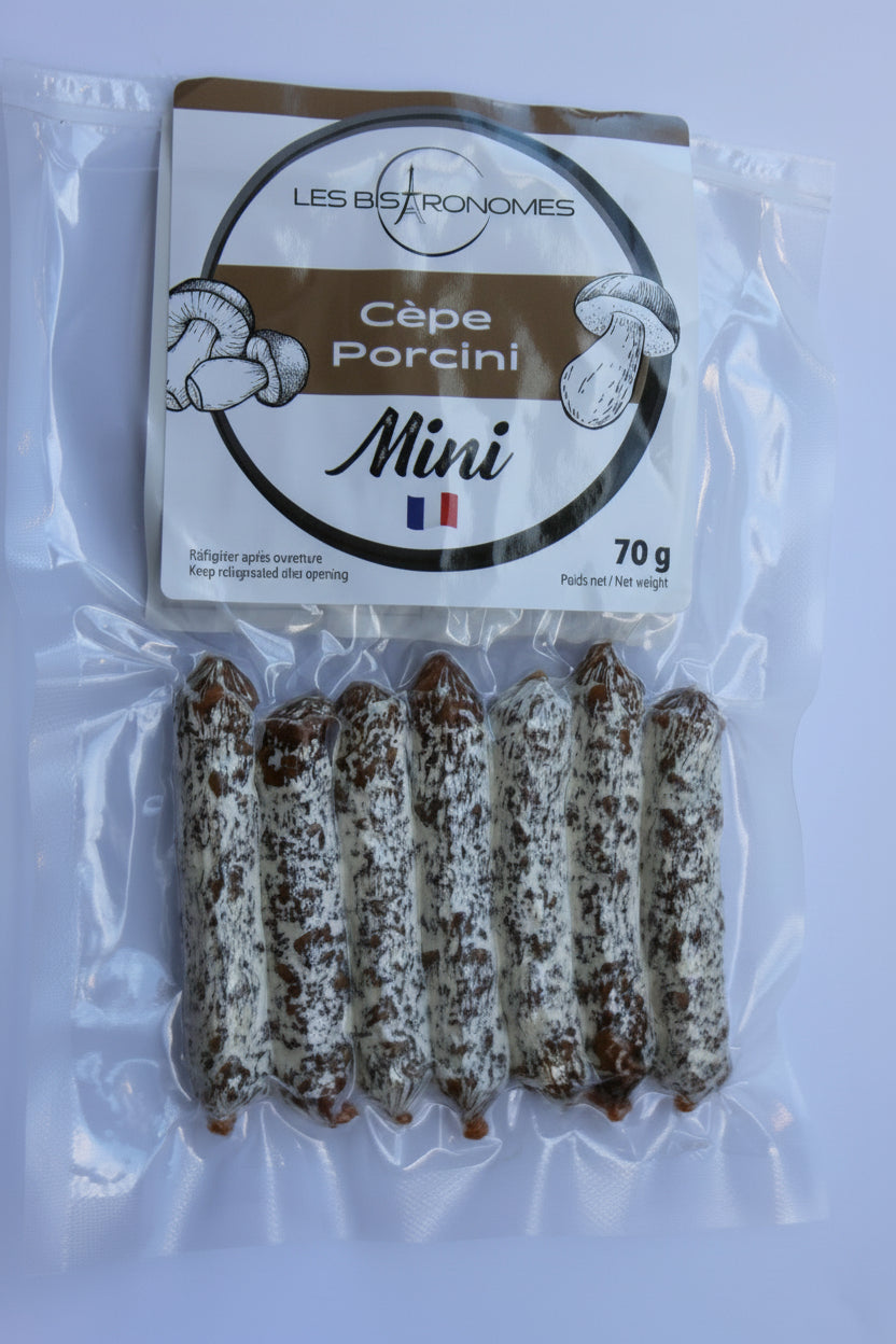 Découvrez ces délicieuses mini saucisses sèches de porc, fabriquées en France selon des méthodes traditionnelles de charcuterie. Élaborées à partir de porc de qualité et assaisonnées d'un mélange savoureux de champignons (dont des cèpes), d'oignons, d'ail, d'échalotes, de persil et d'épices, elles offrent un goût riche et aromatique à chaque bouchée.